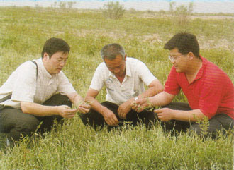 赵宝玉副秘书长(左一)和陈进军博士(中)在青海省进行毒草分市调查(2003年7月)在内蒙古西北部进行草地毒草危害调查(2004年7月)