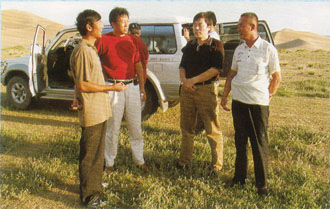 赵宝玉副秘书长(左二)和阿盟兽医站达能太(右二)在内蒙古阿拉善盟额旗进行草地毒草危害调查(2005年7月)