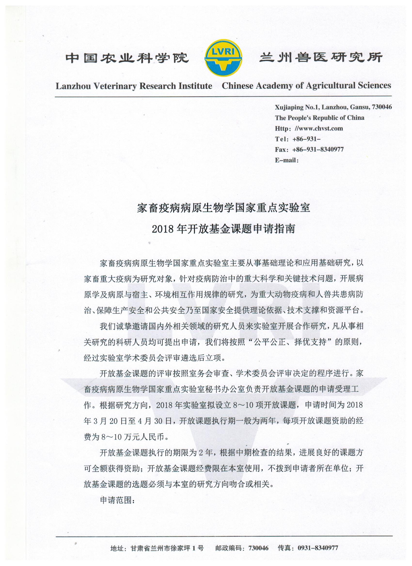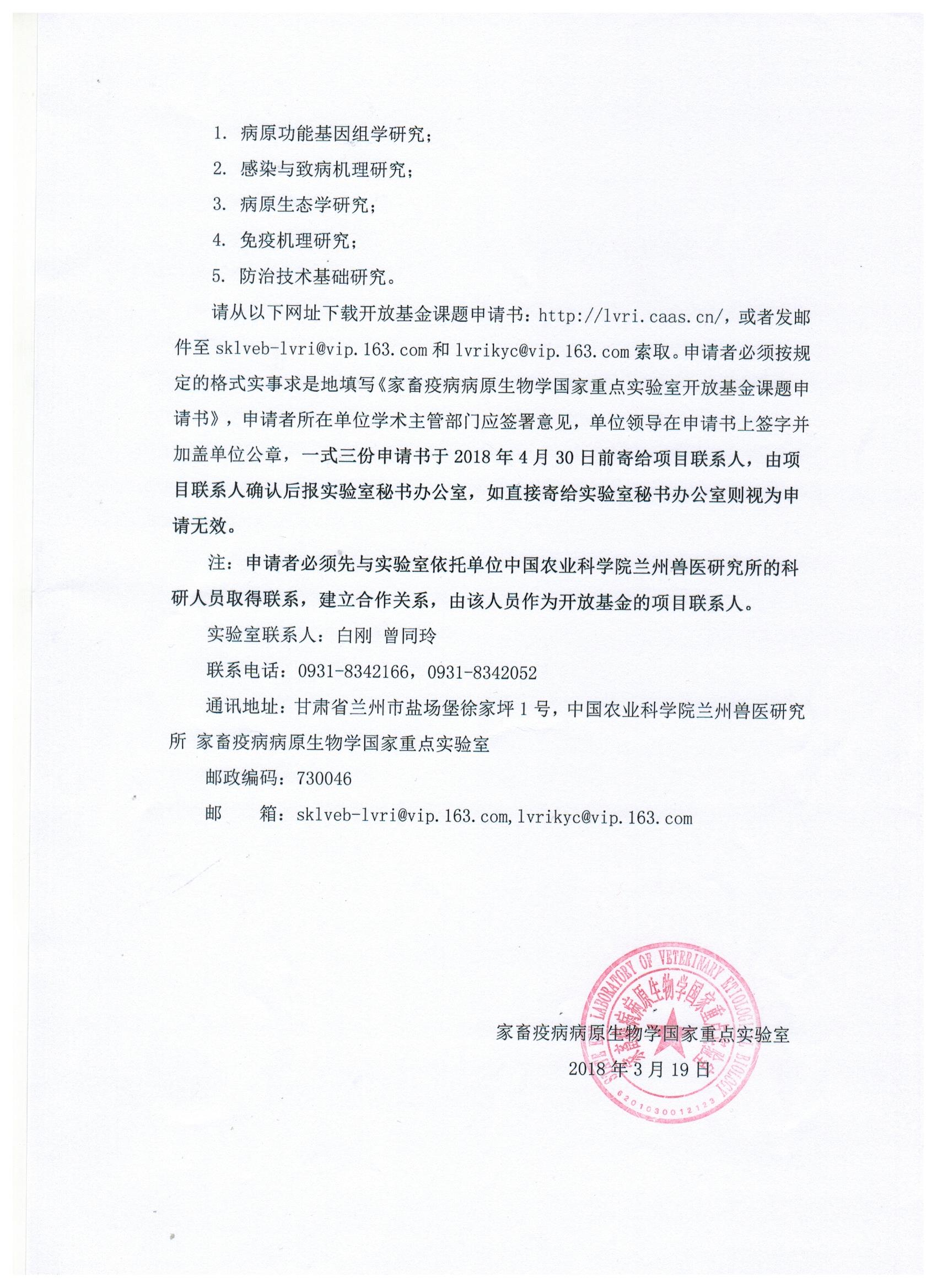 转发《家畜疫病病原生物学国家重点实验室2018年开放基金课题申请指南》