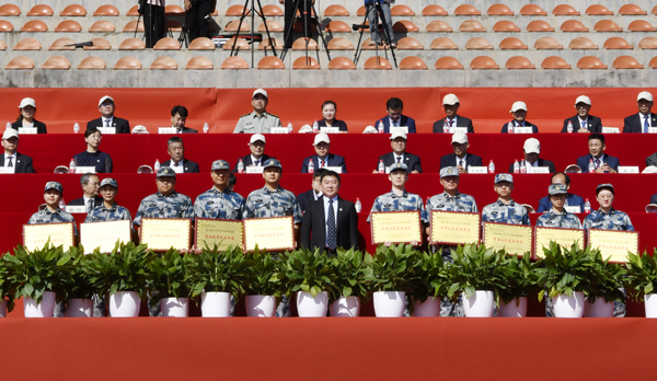 副校长房玉林为军训“宣传教育先进单位”及“军事比武先进单位”获奖学院颁奖