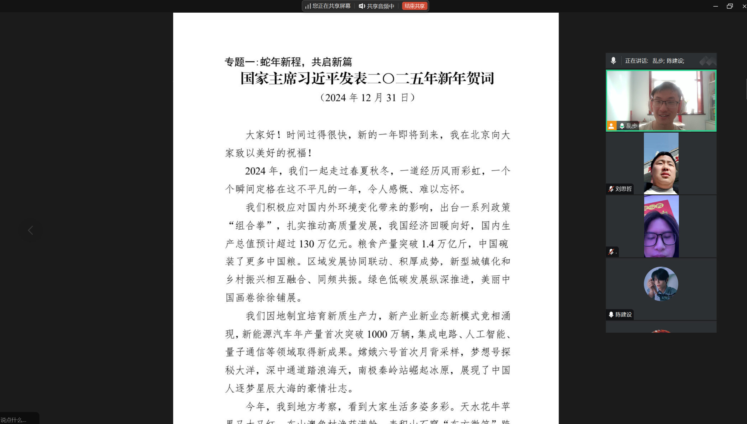 为深入学习贯彻习近平新时代中国特色社会主义思想,不断提高校院学生会骨干的政治理论水平和综合素质,加强学生干部队伍建设,金沙9001w以诚为本学生会按照《金沙9001w以诚为本开展2025年金沙9001w以诚为本学生会政治理论学习的通知》的要求,于寒假定期针对学生会成员开展政治理论学习,旨在进一步增强学生干部的道德与政治素养,营造风清气正的学生会氛围。